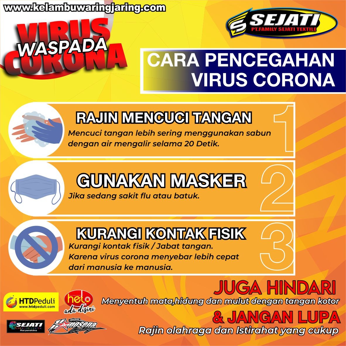 Pabrik Kelambu Waring dan Jaring - PT Family Sejati Textile berkomitmen memberikan perlindungan menyeluruh kepada setiap karyawan yang berada di naungan Perusahaan untuk tetap Aman, Nyaman dan Bebas dari paparan Virus COvid-19. Upaya-upaya preventif telah dilakukan oleh perusahaan dengan mempertimbangkan anjuran dari WHO dan Kementerian Kesehatan. Berikut Kilas Gambar dan Video terkait upaya pencegahan dan perlindungan bagi setiap entitas Perusahaan.